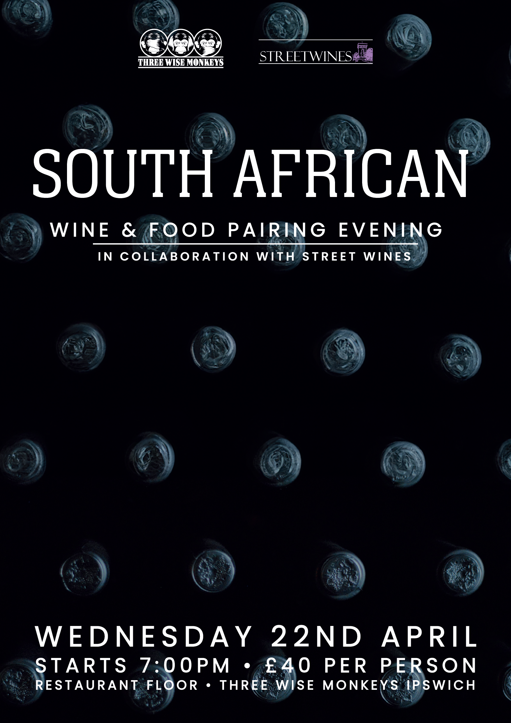 Join us on Wednesday 22nd April for our South African Wine & Food Pairing Evening. Enjoy as we take you through four-courses of seasonally inspired food and wine at Three Wise Monkeys – in collaboration with independent and local wine merchants and suppliers, Street Wines.
